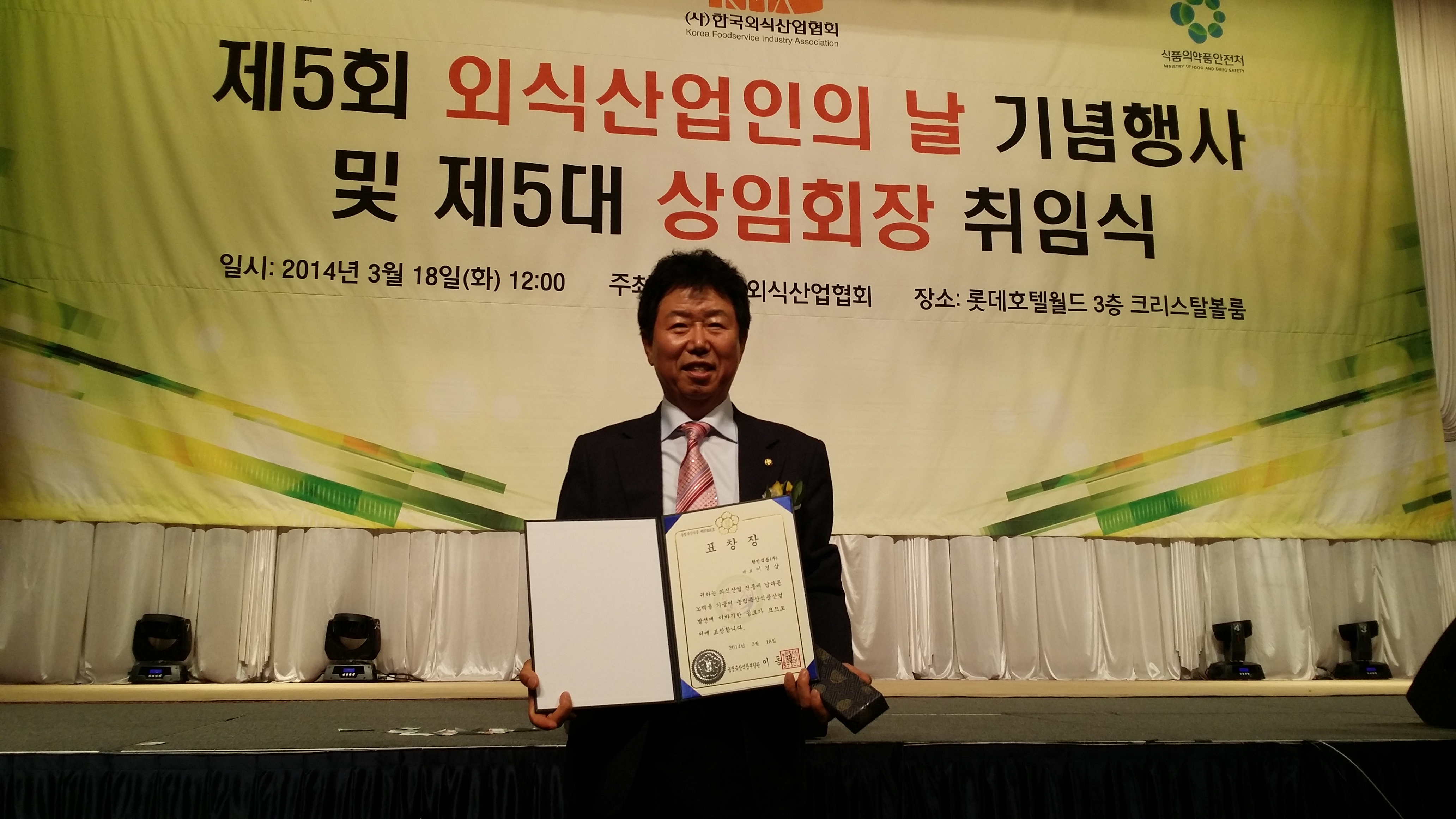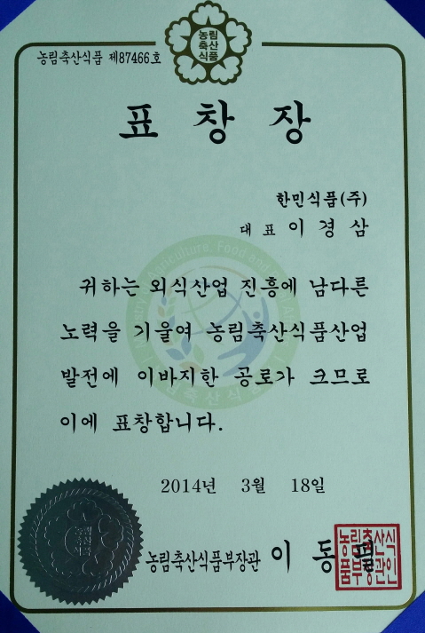 한민식품주식회사 대표이사 이경삼은 지난 3월 18일 제5회 외식산업인의 날을 맞이하여 외식산업 진흥에 남다른 노력을 기울린 공로에 대하여 농림축산식품부 장관 표창을 받았습니다.